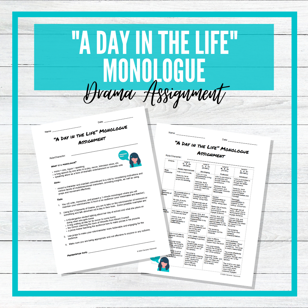 They will write a minute-long script, where they take on the role/character of someone or something and discuss a day in their lives. Then, they will memorize and present their monologue in front of an audience, paying careful attention to incorporate the 5 Elements of Drama.