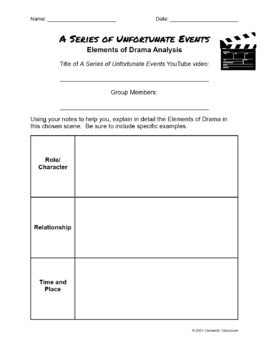 In small groups, students will choose any video clip from A Series of Unfortunate Events available on YouTube. They will then work together to analyze all of the Elements of their chosen scene, using specific examples.
