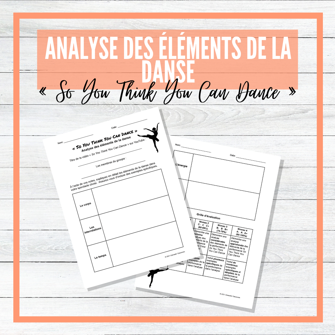 If you teach Dance in French, this resource can be used for students to demonstrate their learning and their ability to analyze the 5 Elements of Dance (Corps, Interrelations, Temps, Énergie, Espace) in a specific performance.