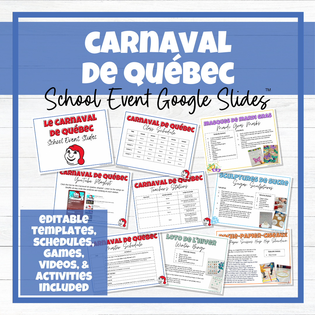 Carnaval de Québec - Festival d'hiver - School Event Editable Google Slides™: This Carnaval event is designed in a way so that classes can travel from room to room to complete different activities throughout the day. Classroom teachers lead the one event they're assigned to in their own classroom, with different classes rotating around the school to different stations, throughout the entire day.