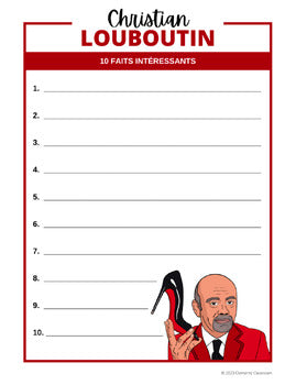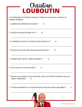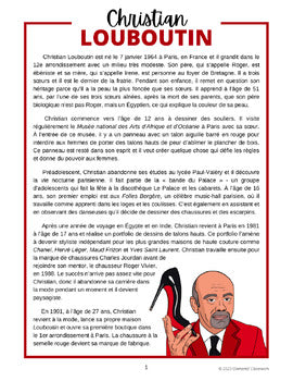 This French biography resource contains informative text about the life of the famous French fashion designer Christian Louboutin, followed by a variety of activities to build upon and assess your Junior/Intermediate students' reading comprehension and writing skills.