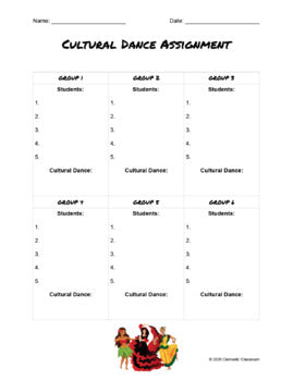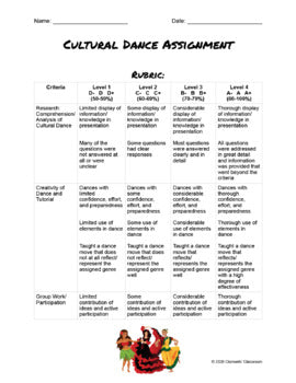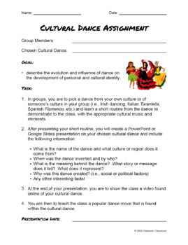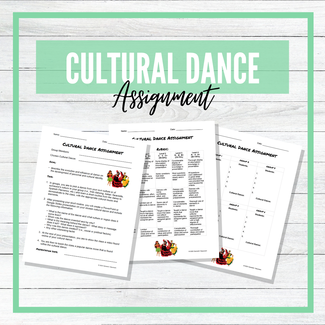 This Cultural Dance Assignment teaches students to appreciate diverse cultures through dance, as well as teaches them about the evolution and influence of dance on the development of personal and cultural identity.
