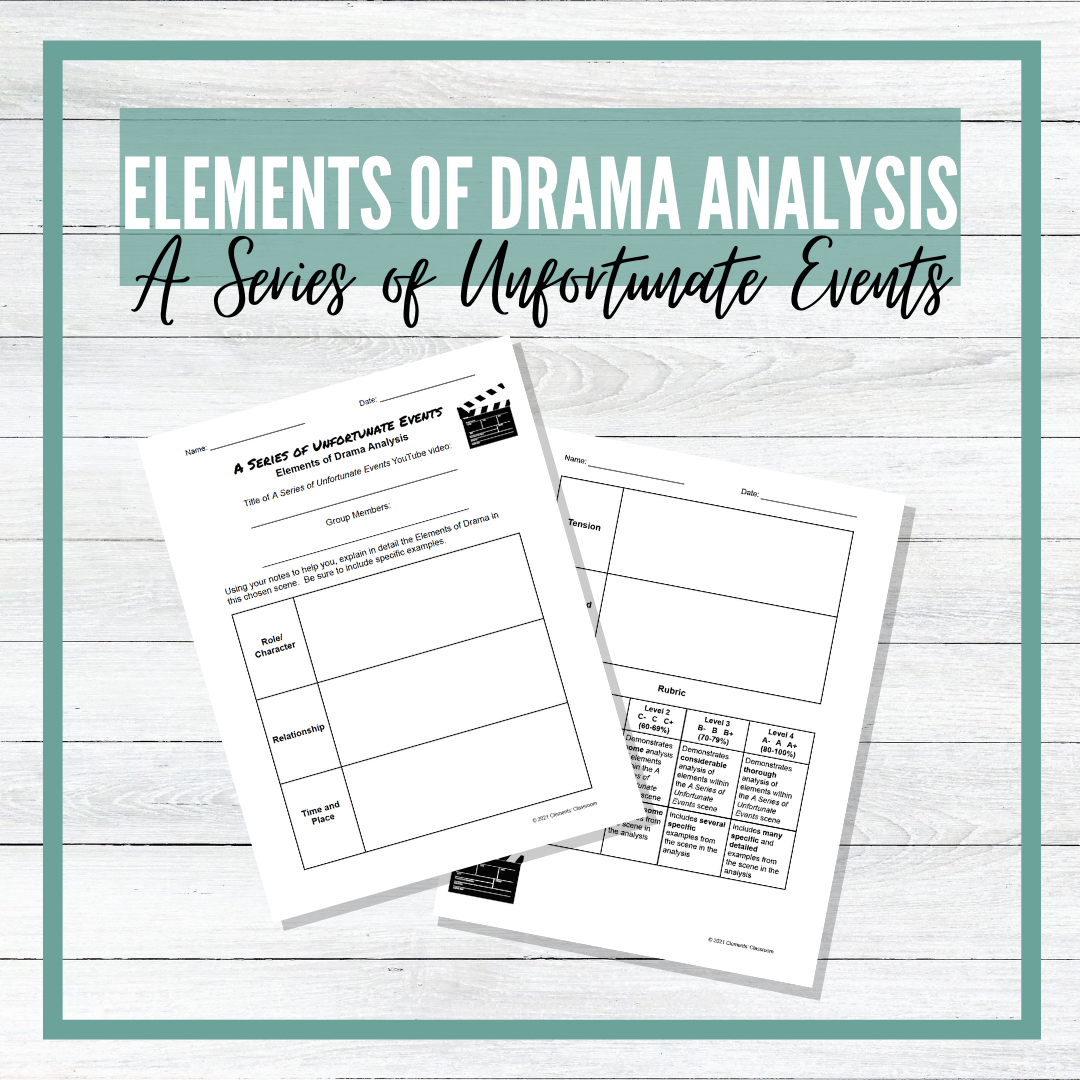 A Series of Unfortunate Events - Elements of Dance Analysis: After learning about the 5 Elements of Drama (Role/Character, Relationship, Time and Place, Tension, & Focus and Emphasis), this resource can be used for students to demonstrate their learning and their ability to analyze all of the Elements in a specific dramatic piece. In small groups, students will choose any video clip from A Series of Unfortunate Events available on YouTube. They will then work together to analyze all of the Elements of their chosen scene, using specific examples.