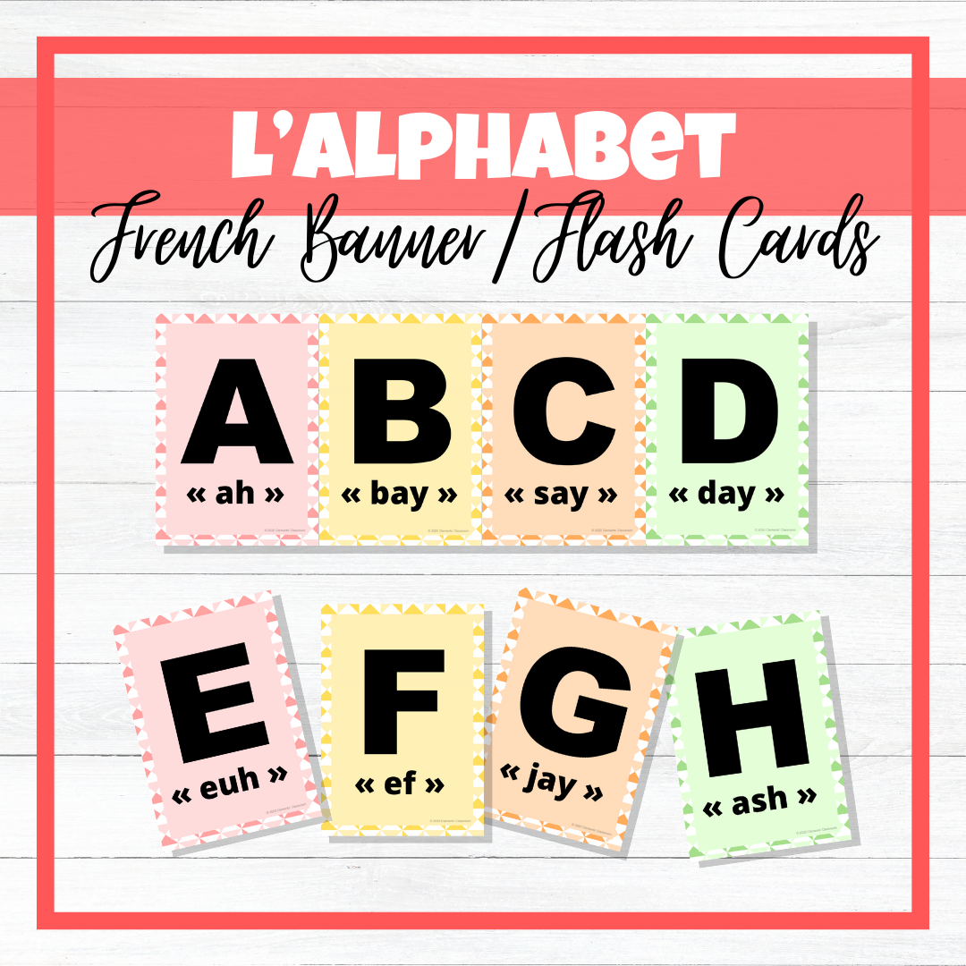 French Alphabet Banner / Flash Cards: Brighten up your French classroom with this French alphabet banner! This banner includes all 26 letters, as well as the pronunciation of every letter. Once displayed on your classroom wall, beginner French students can use this resource as a quick reference and anchor chart. All you have to do is print, cut, and laminate! This product can also be used as flash cards.
