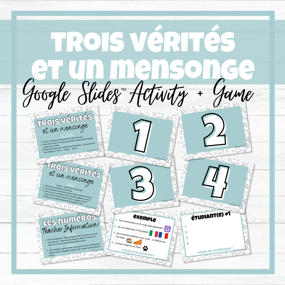 Trois vérités et un mensonge - French Google Slides™ Activity & Game: This resource is a fun and authentic way for students to write and speak about themselves in French, and is also a great opportunity for students to practice their listening and reading comprehension skills by understanding information about their peers.
