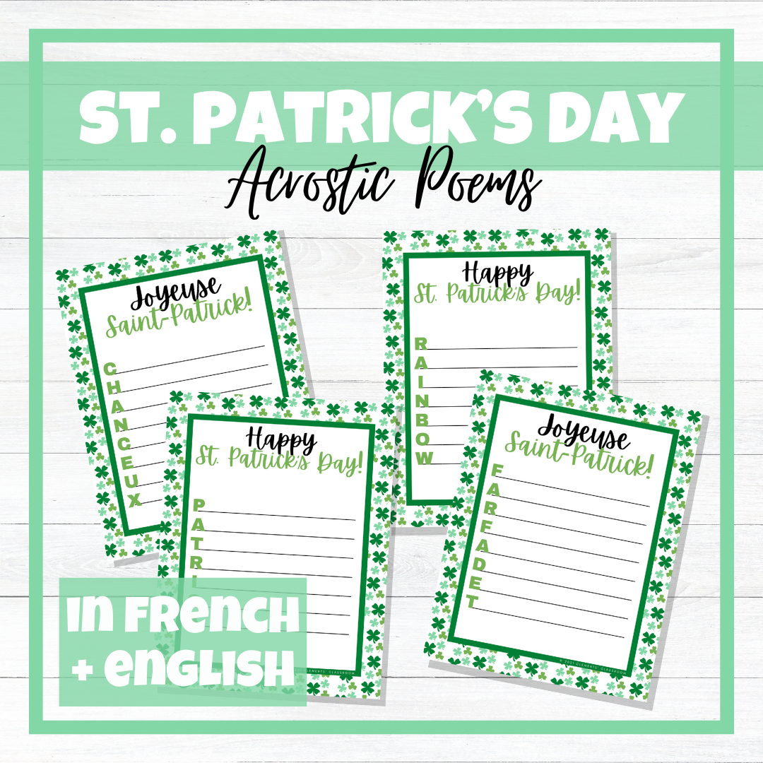 Jour de la Saint-Patrick - St. Patrick's Day - Acrostic Poems - English & French: This resource includes 4 acrostic poem writing activities, available in both English and French, to celebrate St. Patrick's Day in your classroom! Students are to create acrostic poems or poèmes acrostiches using the following words related to St. Patrick's Day or La Saint-Patrick: