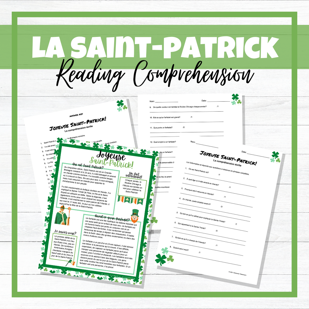 Jour de la Saint-Patrick - St. Patrick's Day French Reading Comprehension: This Saint-Patrick Reading Comprehension resource is an authentic way to celebrate St. Patrick's Day in your French classroom, while also practicing and assessing French reading comprehension skills! Students are to read information in French about the history of St. Patrick and leprechauns, along with fun facts about St. Patrick's Day around the world. Then, they are to answer questions in French pertaining to the information they read.