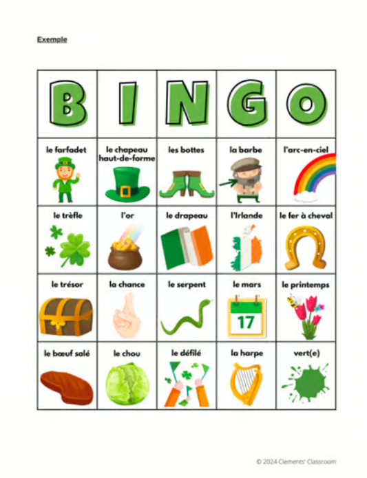 Included are also Teacher Calling Cards, which are larger versions of the 20 French St. Patrick's Day vocabulary items for you to cut out and randomly select for students to match on their own Bingo sheet and put a chip marker on top. The first students to get a straight line either vertically or horizontally (your choice) wins the game.
