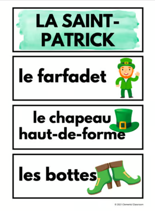 The Mur de mots (Word Wall) includes all of the vocabulary words that are in the vocabulary activity, along with an image beside each word. This can be displayed in your French classroom on a bulletin board in March as a visual reference for students throughout your St. Patrick's Day unit. Just print, cut, laminate, and enjoy!