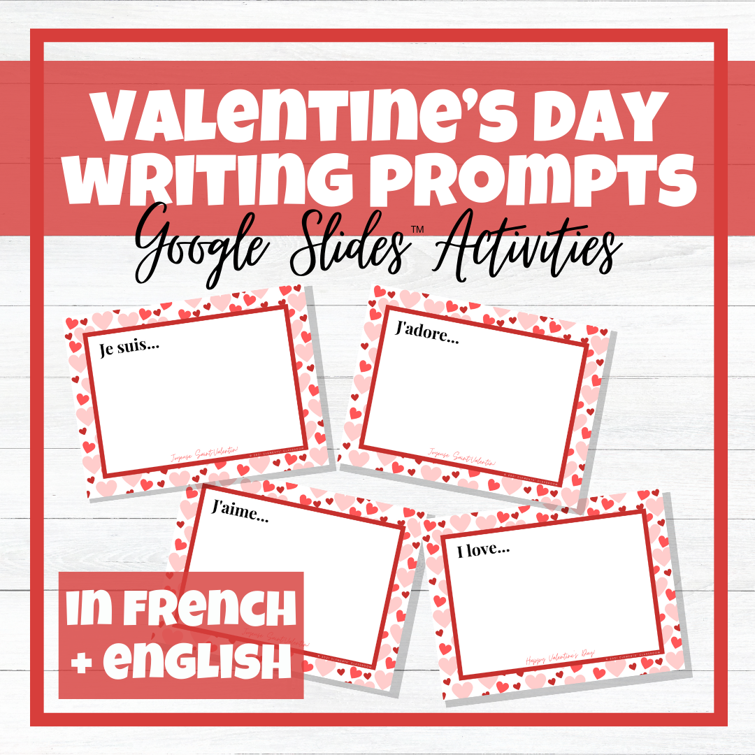 Saint-Valentin/Valentine's Day - Google Slides™ Writing Prompts - French/English: Celebrate La Saint-Valentin or Valentine's Day in your French and English classrooms with these Google Slides™ Writing Prompts! Included in the Slides are 3 Writing Prompts available in both ENGLISH and FRENCH that your students can directly type on: