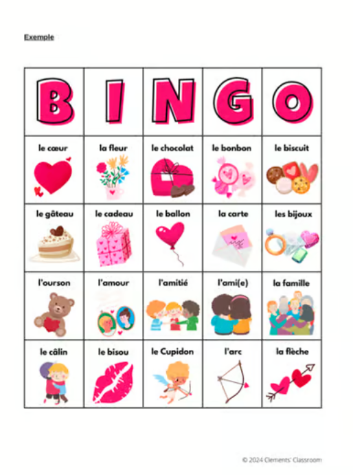 This Loto de la Saint-Valentin Bingo game is an excellent way for your students to develop their French vocabulary! Students are given a BINGO/LOTO/AMOUR player template card (it is your choice as the teacher which title of the playing card that you want to distribute), as well as a paper with the 20 French Valentine's Day vocabulary items. They are to cut out all of the images and glue them to the playing card in any order they would like. Once cut out and glued, you can laminate the sheets so that you can reuse them every year!