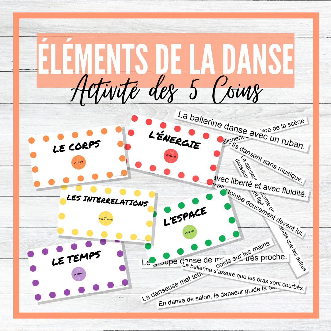 Les éléments de la danse - Activité des 5 coins - French Dance Activity: If you teach Dance in French, this interactive 5 Corners Activity is a fun and engaging way for students to further understand the 5 Elements of Dance! Each student will receive a sentence that analyzes a dancer's performance. The student then has to decide which Element the sentence relates to and moves to the section of the classroom with that Element label. All you have to do is cut out the 5 Elements and sentences, then laminate! Place the 5 Elements around the classroom and the sentences in an envelope for students to pick from. This activity leads to effective classroom problem-solving and discussion!