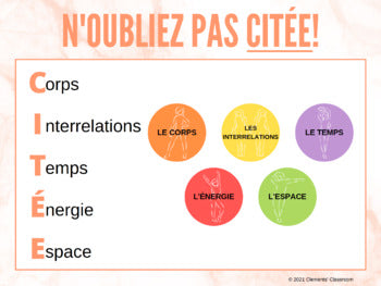 Corps (Body), Interrelations (Relationship), Temps (Time), Énergie (Energy), and Espace (Space). Included is also template for your students to use to copy the note.
