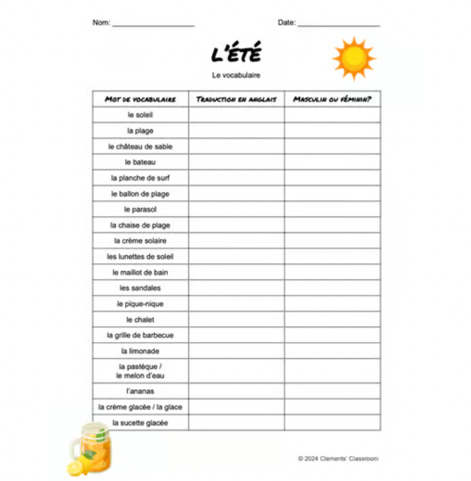 This resource consists of 22 vocabulary words related to l'été (summer), where students will practice their dictionary skills by not only finding the English translation, but also discovering if the word is masculine or feminine. An answer key is included.