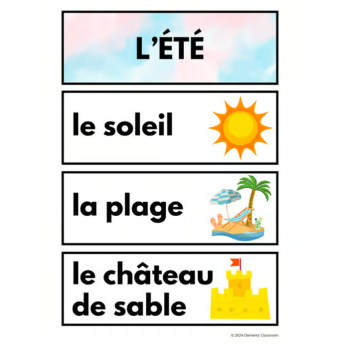The Mur de mots (Word Wall) includes all of the vocabulary words that are in the vocabulary activity, along with an image beside each word. This can be displayed in your French classroom on a bulletin board during the summer season as a visual reference for students throughout your unit. Just print, cut, laminate, and enjoy!