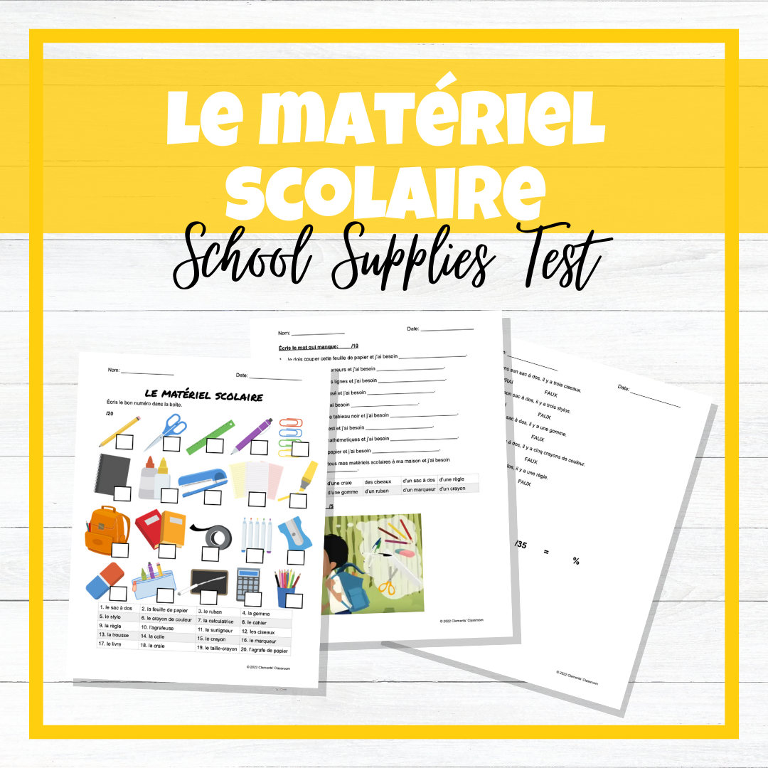 Matériel Scolaire - School Supplies - Test: This reading comprehension test is an excellent summative assessment to finish your unit of « Le Matériel Scolaire » ! There are three sections in this test to assess student knowledge of school supplies vocabulary: labelling, fill in the blanks, and true or false. This resource also includes an answer key to help you with grading efficiently.
