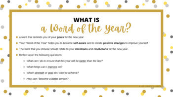 This activity is great resource to complete in your class at the beginning of January, as students can take the time to reflect upon the previous year and make resolutions for improvement. The slides teach students about the value of choosing a "Word of the Year" and provide an opportunity for the class to brainstorm words together. Each student is then assigned one slide with their name on it and they are tasked to choose/write their specific word of the year, then decorate the slide with images to represent their chosen word. In my classroom, I have the students share their word with the rest of the class and briefly explain the importance of how this word reflects their goals or intentions for the year ahead.