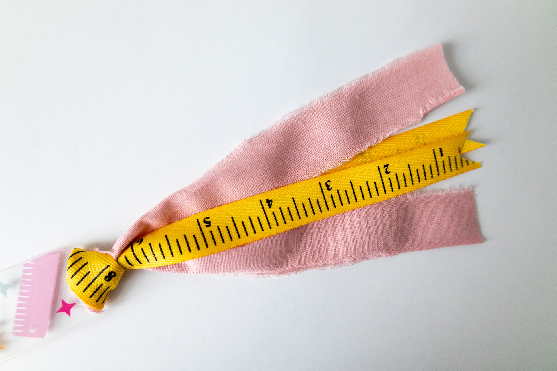 Finishing Touch: Two charming ribbons are attached - a soft, flowing pink chiffon ribbon, and a yellow twill measuring tape ribbon for a fun classroom vibe.