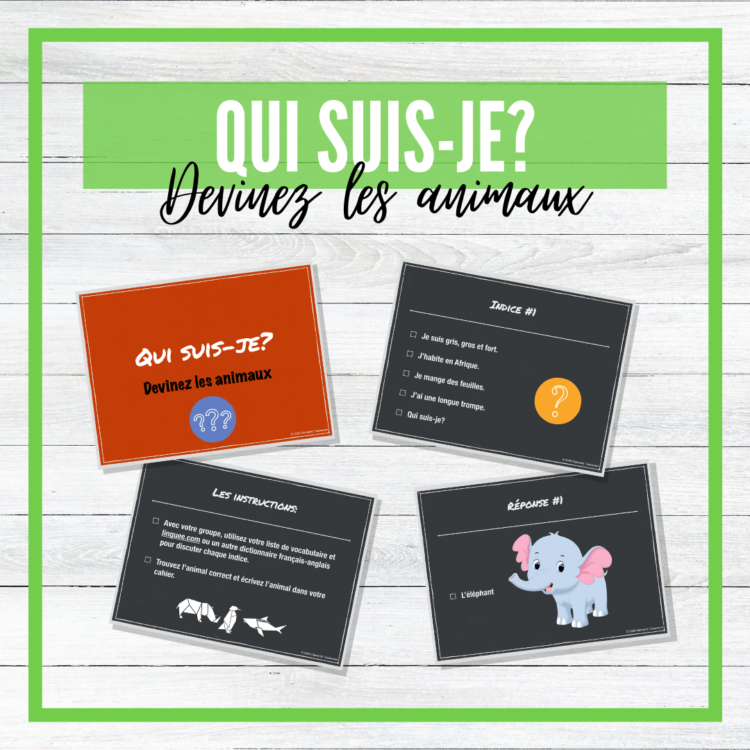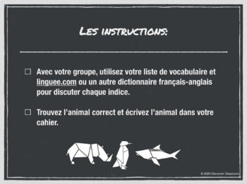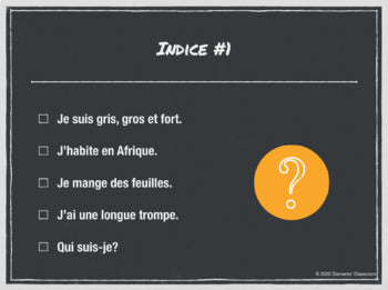 This Qui suis-je? Devinez les animaux PowerPoint presentation is a fun reading comprehension game for students to work with their peers to practice animal-related vocabulary, while improving their reading skills, logical reasoning, and inference skills in French! In groups, students are to read the clues provided and discuss which animal is being described. This is an excellent resource to encourage oral communication in French beginners, while also building upon their reading skills by identifying important points and highlighting key words.