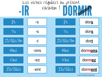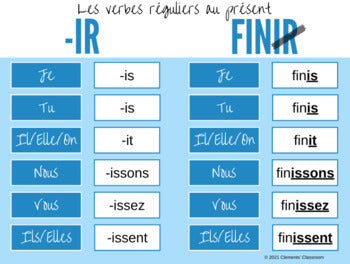 This Google Slides™ resource is a concise and effective way to teach les verbes réguliers -IR au présent (regular -IR verbs in the present tense) and have students practice how to conjugate -IR verbs according to le pronom sujet (the subject pronoun).
