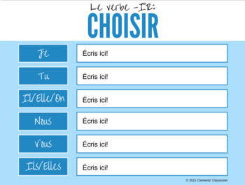 Included in the Slides is a mini-lesson with an example using the verb finir, followed by 10 practice cards that your students can type directly on. There are also two other mini-lessons included if you want to further teach the two -IR variations (-IR verbs that are conjugated like dormir and -IR verbs that are conjugated like ouvrir). The two -IR variations are also each followed by 5 practice cards that your students can type directly on.