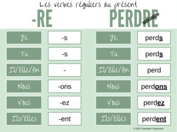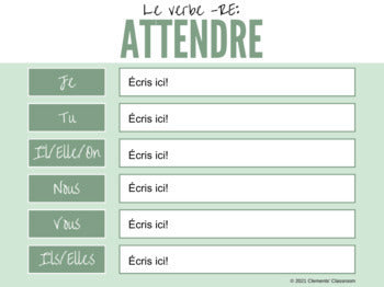This Google Slides™ resource is a concise and effective way to teach les verbes réguliers -RE au présent (regular -RE verbs in the present tense) and have students practice how to conjugate -RE verbs according to le pronom sujet (the subject pronoun).