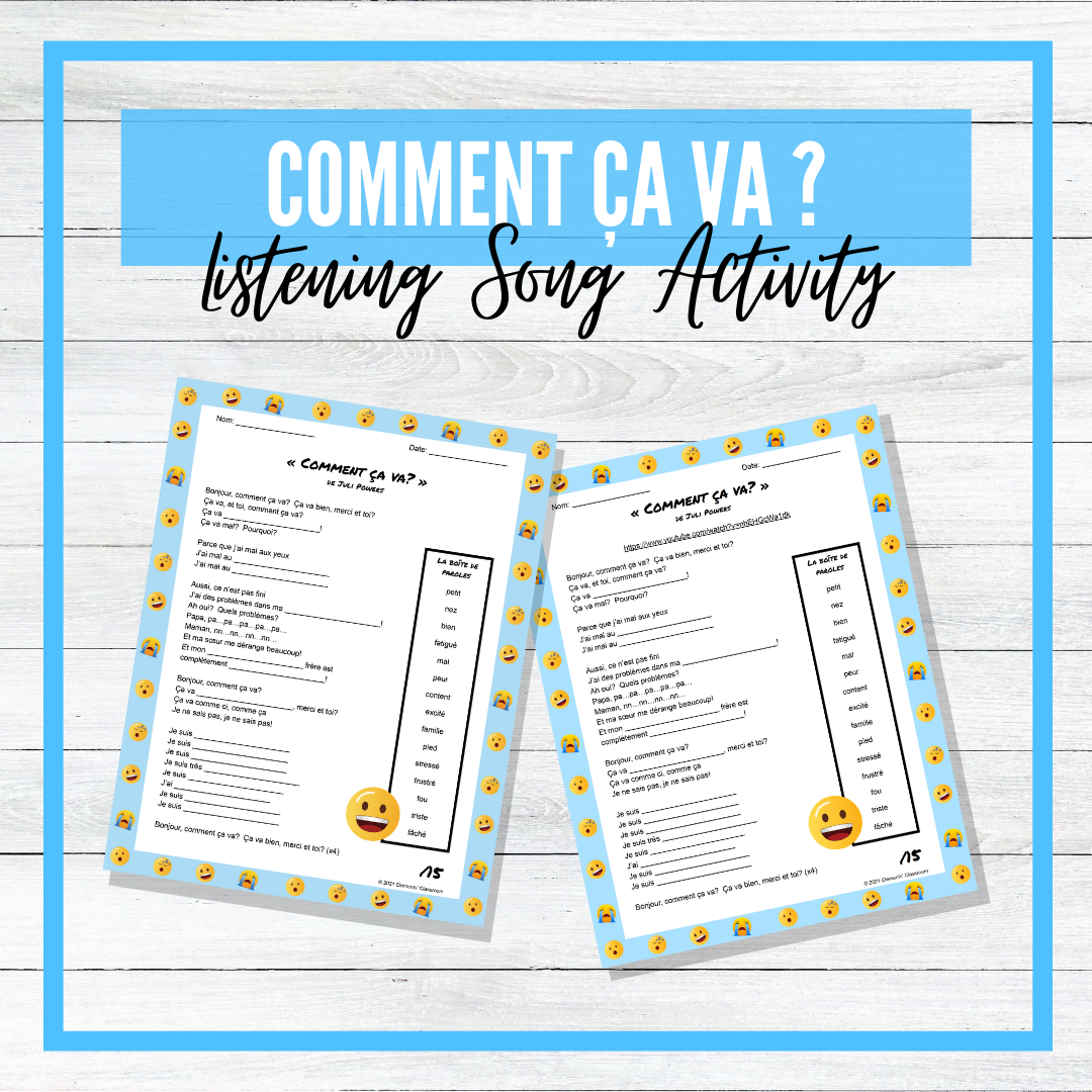 Comment ça va ? - French Song / Chanson - Fill in the Blanks - Listening Activity: This fill-in-the-blank listening activity to the song « Comment ça va? » by Juli Powers is a great way to practice and assess French listening comprehension skills! Students will listen to the song and use the word box to fill in the missing lyrics. I like to play the song 3 times, pausing the music after every blank to give students time to find the missing word. There are 15 fill-in-the-blanks related to Les sentiments et les émotions (feelings and emotions) vocabulary. Included are two versions of the activity (one with a link to the song on YouTube for easy access and one without), as well as an answer key for efficient grading!
