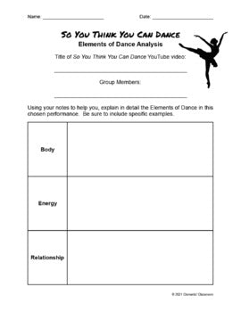 After learning about the 5 Elements of Dance (Body, Energy, Relationship, Time, and Space), this resource can be used for students to demonstrate their learning and their ability to analyze all of the Elements in a specific performance.