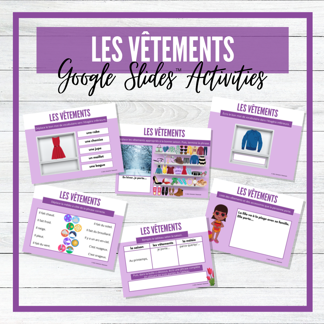 These « Vêtements » interactive Google Slides™ include six different activities to build your students' vocabulary related to clothing and accessories in French!