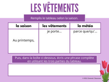 In the fifth section, students are to complete a chart listing the correct clothing items for each season, based on the weather. They are to then create a complete sentence using the three sections of the chart to help them.