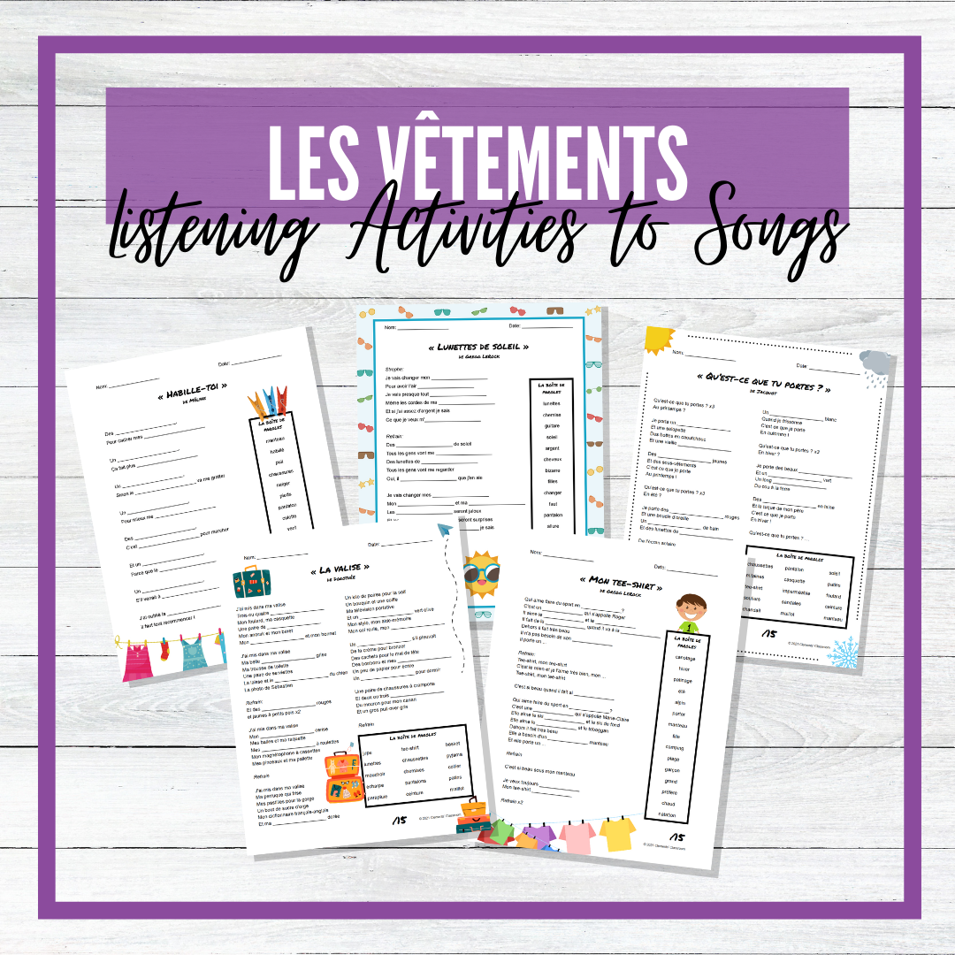 Vêtements - French Songs / Chansons - Fill in the Blanks Listening Activities: These fill-in-the-blank listening activities to French songs about les vêtements (clothing) are a great way to practice and assess French listening comprehension skills, while also building vocabulary!