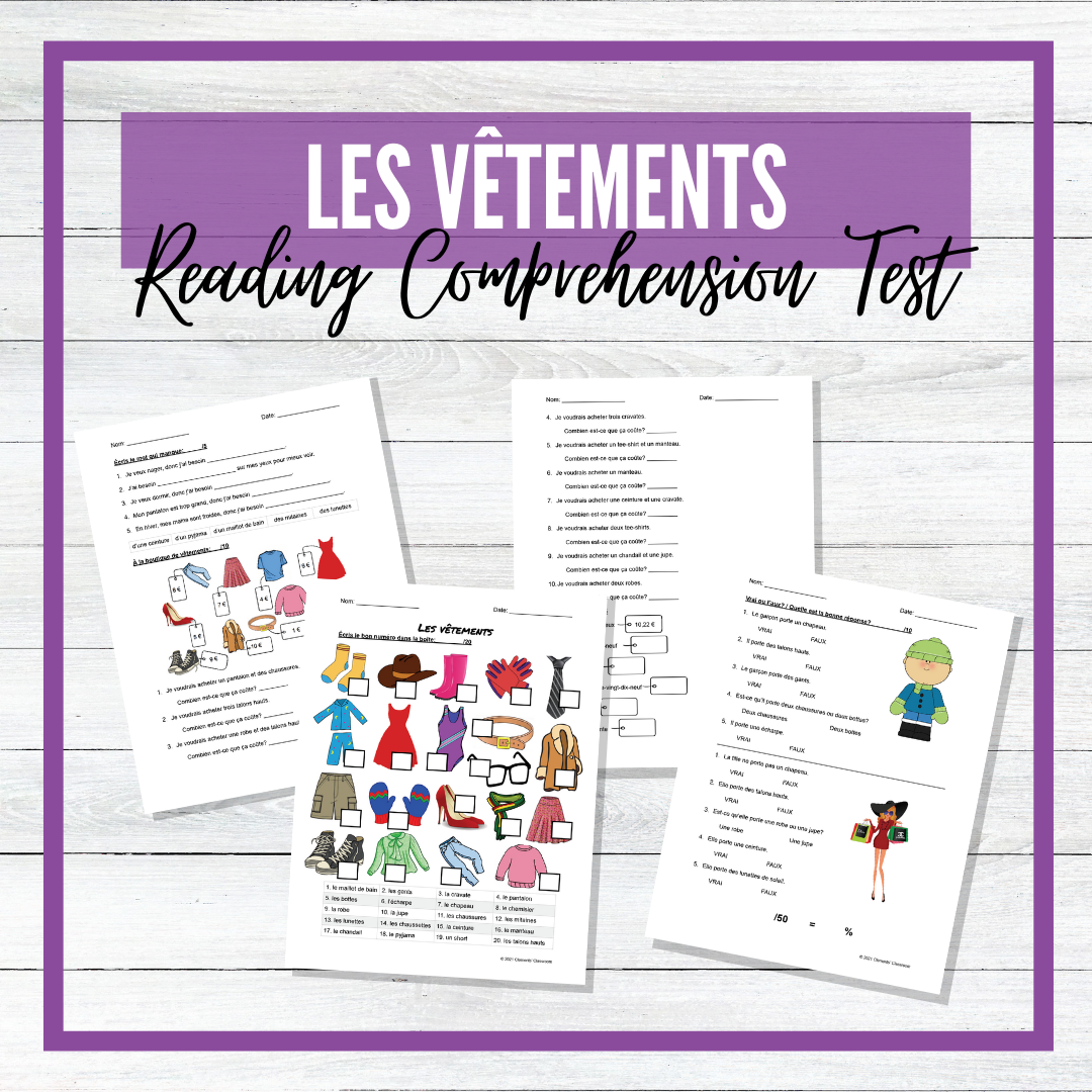 Vêtements - French Clothing - Reading Comprehension Test: This test is an excellent summative assessment to finish your French unit of « Les Vêtements » ! There are five sections in this reading comprehension test to assess student knowledge of clothing vocabulary and French currency: labelling, fill in the blanks, add the total cost of clothing items, write the price (in euros), and true or false. This product also includes an answer key to help you with grading efficiently. You can use this test to help you with the backward design planning process.