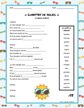 Students will listen to the song and use the word box to fill in the missing lyrics. I like to play the song 3 times, pausing the music after every blank to give students time to find the missing word. There are 15 fill-in-the-blanks related to Les vêtements (clothing) vocabulary in each song. The songs are arranged in level of difficulty from easy to hard, which is perfect for teachers who teach French to many different grades!