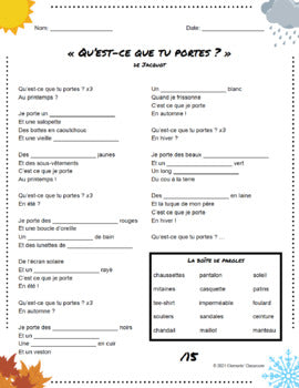 Included in this resource are 5 activities to the following fun French clothing songs: